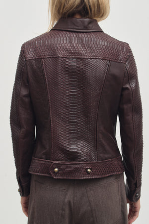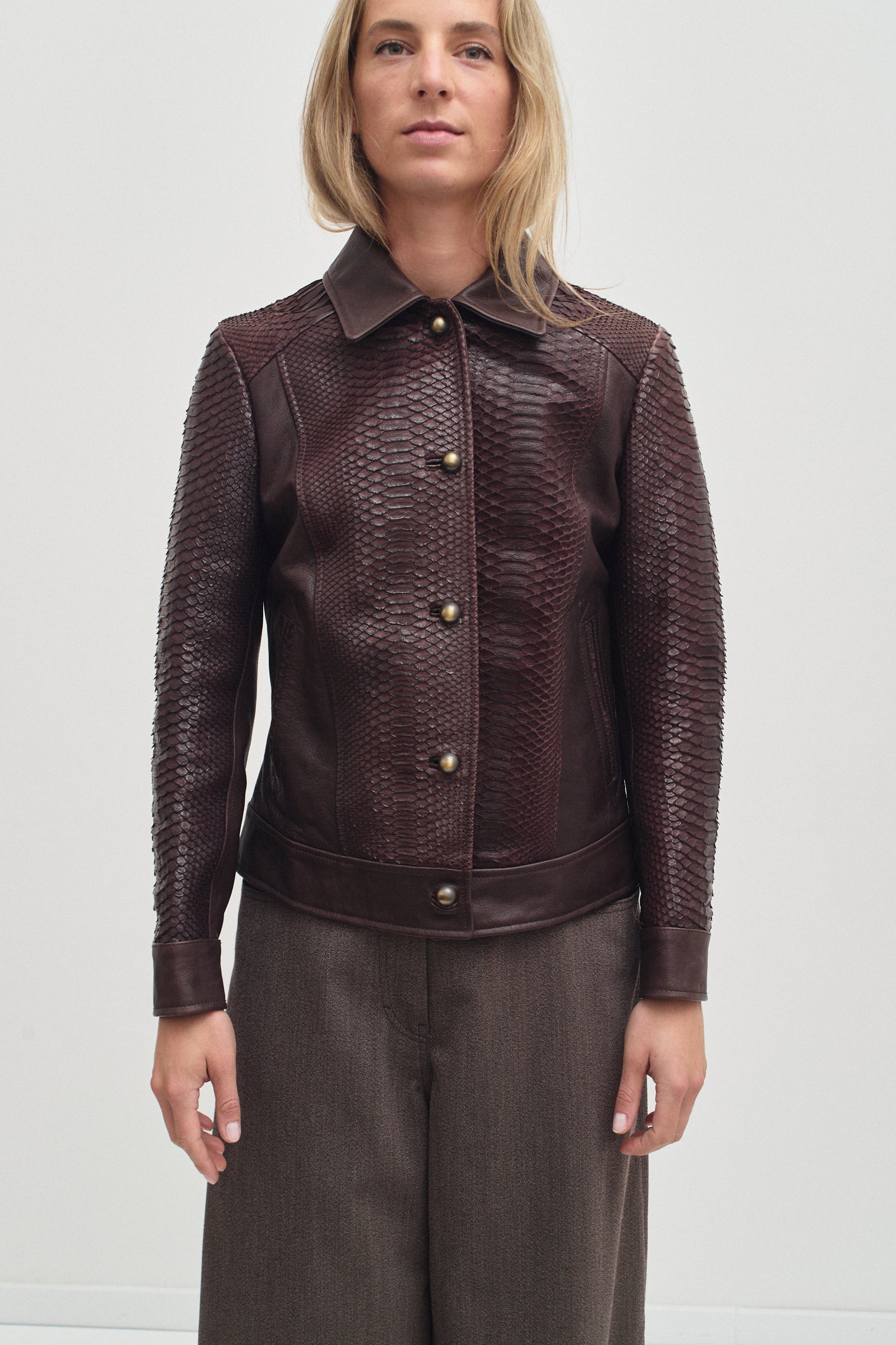 Falor dark brown leather jacket in premium snake skin leather-effect. Square fit, designed with a classic button-front closure and structured collar.