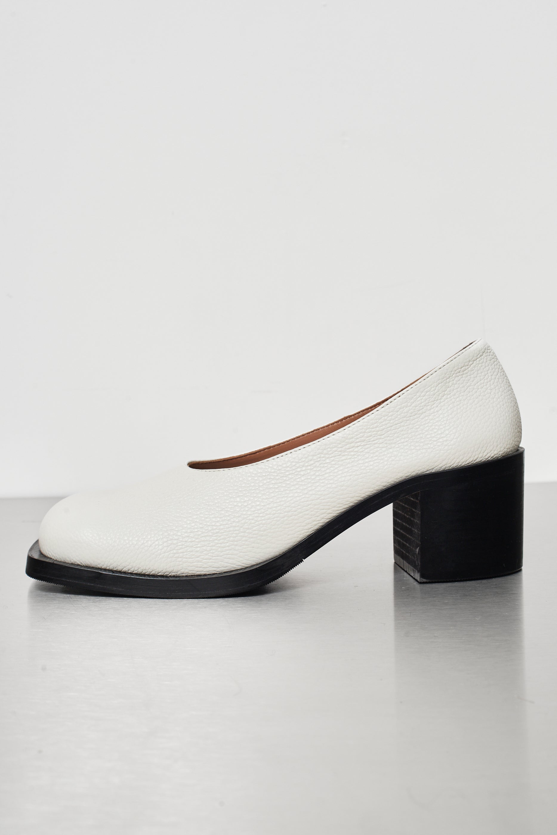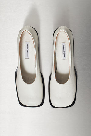 Marianne heels with a square toe and black sole in smooth white leather. Minimal, modern, and perfectly balanced for everyday elegance.