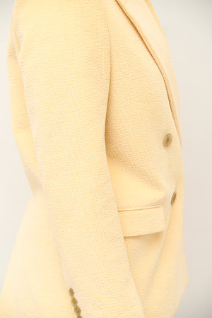 Acne Studios yellow corduroy double-breasted blazer. Designed with a wide peak collar, hidden interior pocket, and three decorative exterior pockets for a clean finish.