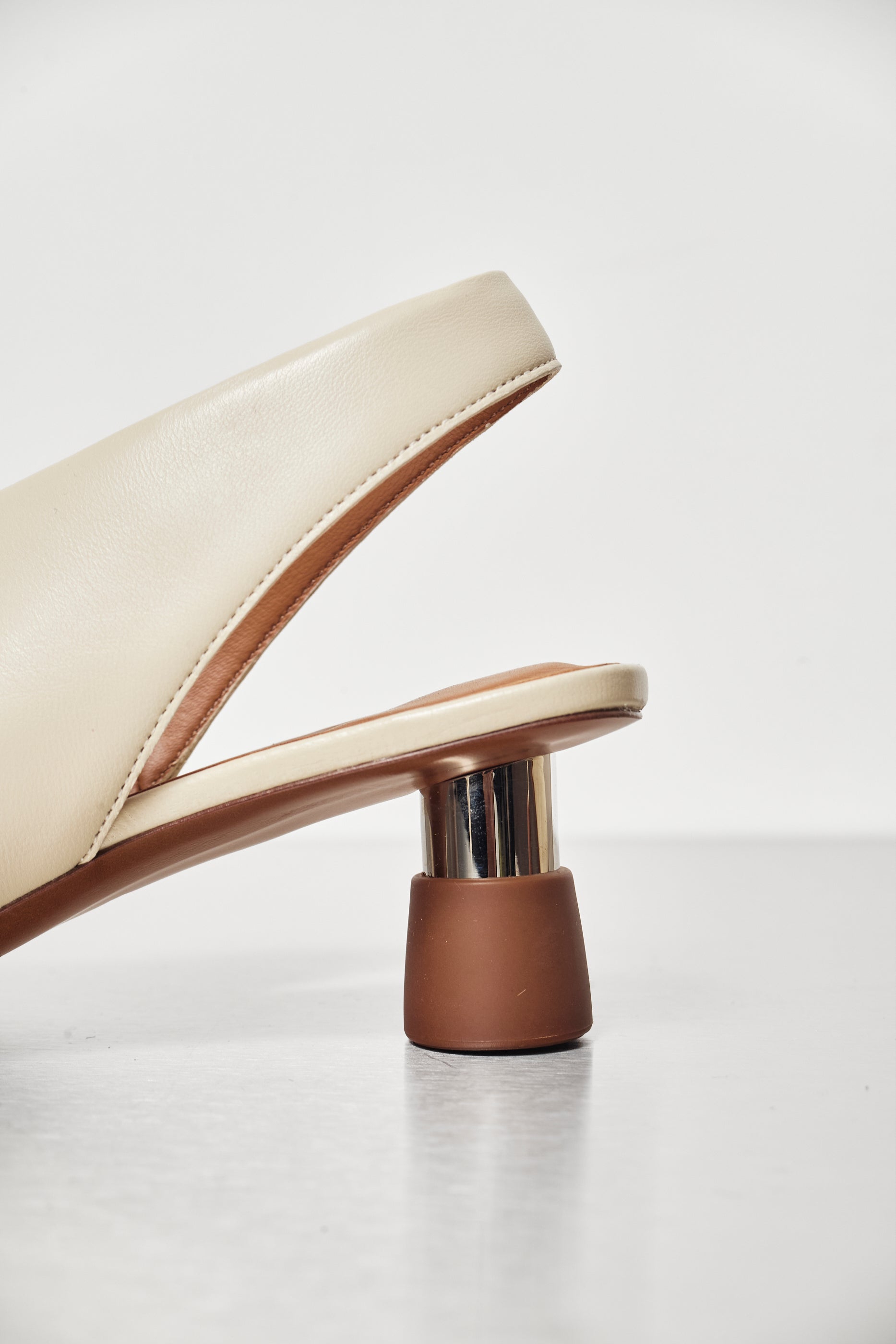 Clergerie slingback heels in creamy leather with brown and silver details. Features a round toe, split seam accent, and a playful sculpted heel — refined with a touch of fun.