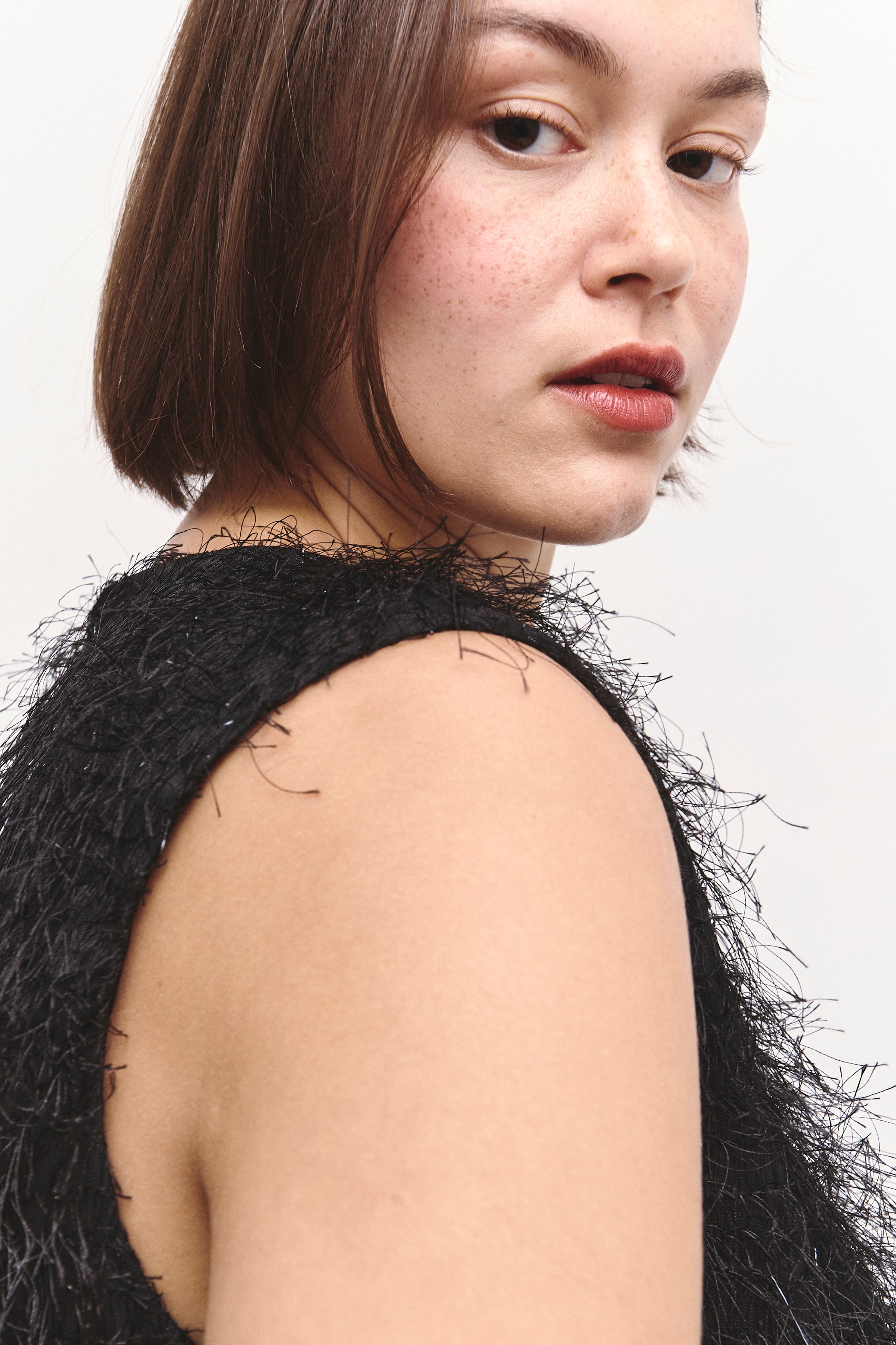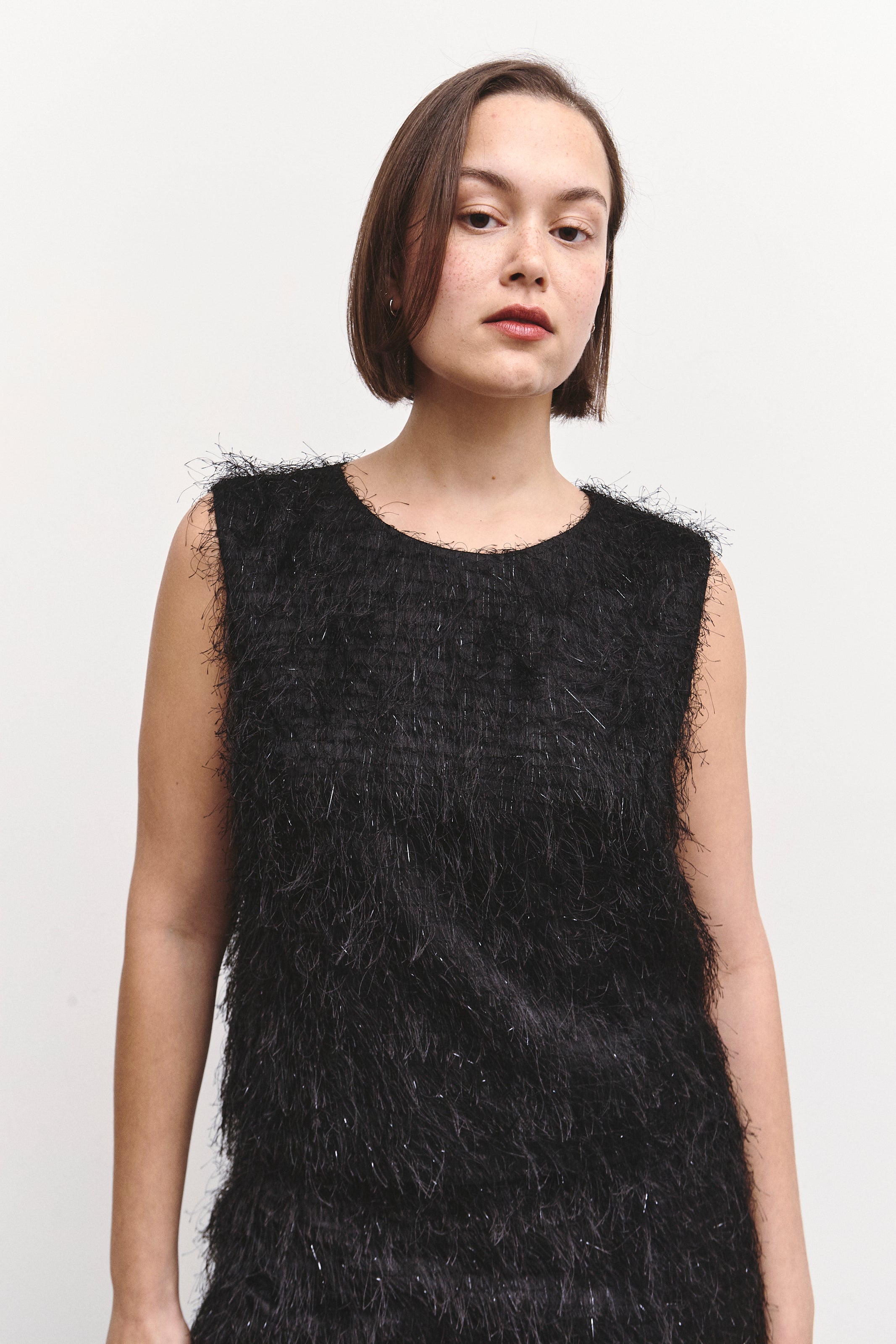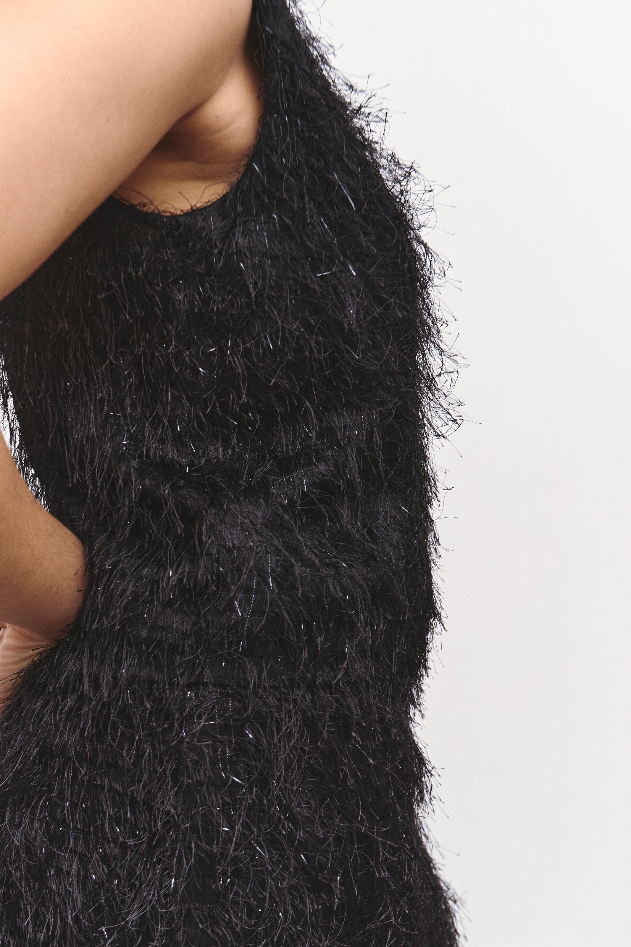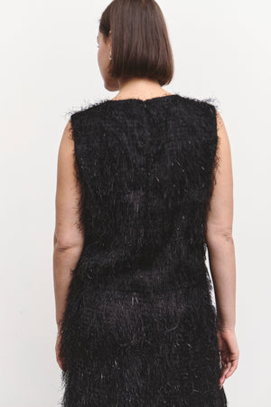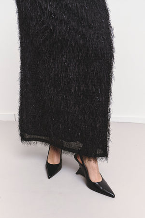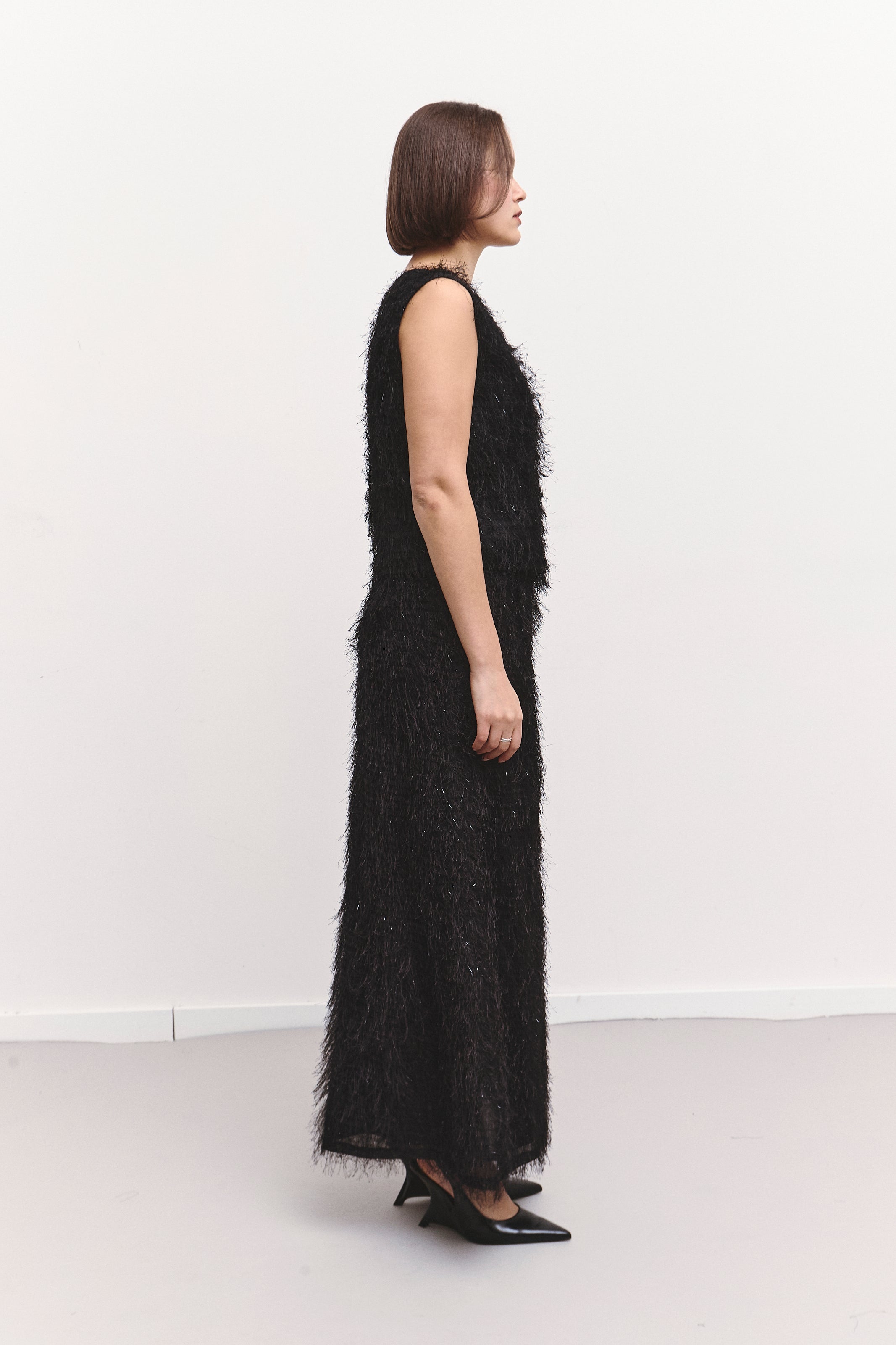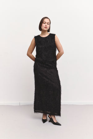 A black glitter two-piece set with playful tassel details. The flowy top and long skirt create a festive, effortless look—perfect for special occasions.