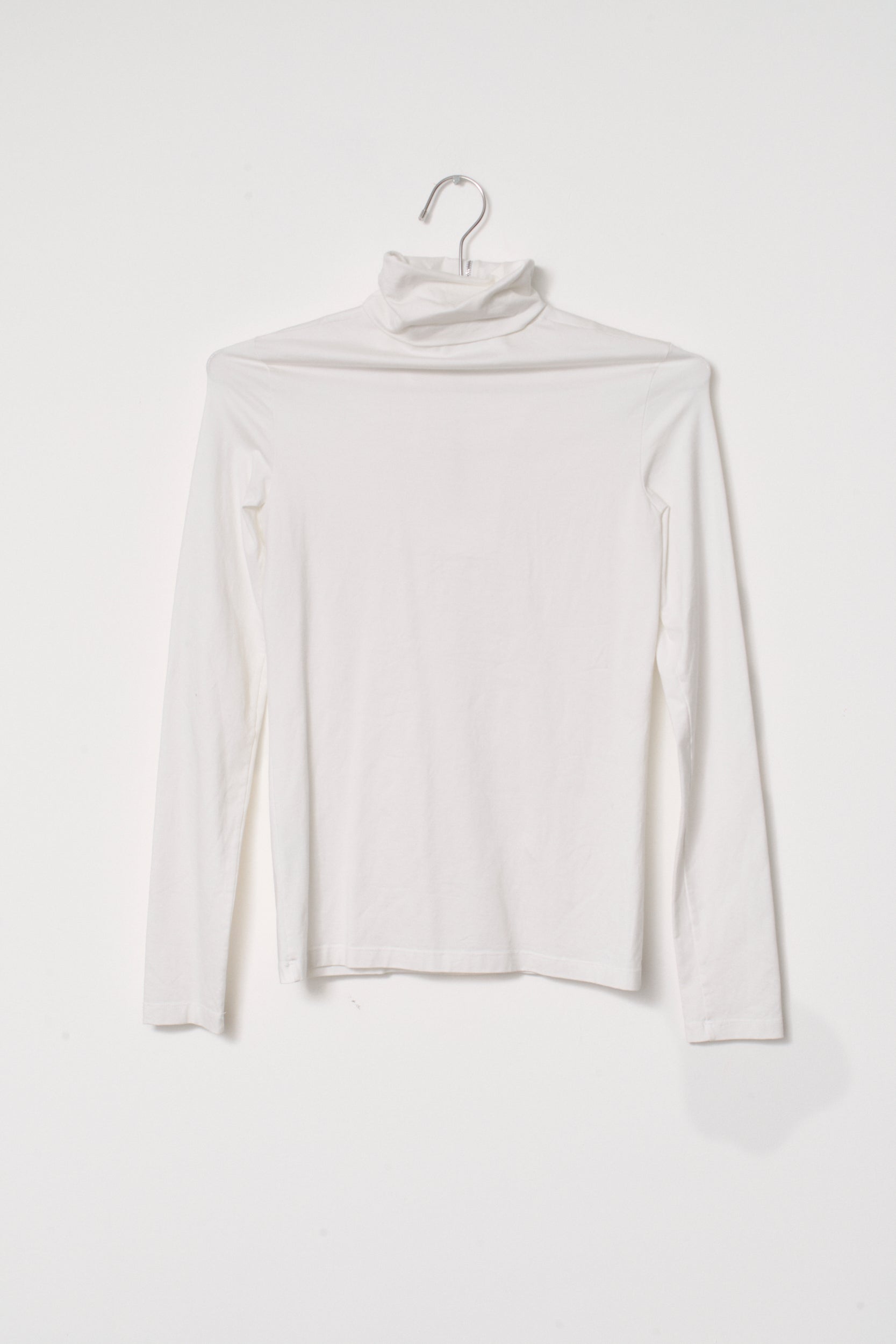 Minimalist white long-sleeve top by Jil Sander, featuring a soft turtleneck with a half-zip closure. Crafted from a smooth cotton blend with a clean, streamlined silhouette. A refined essential for layering or wearing on its own.