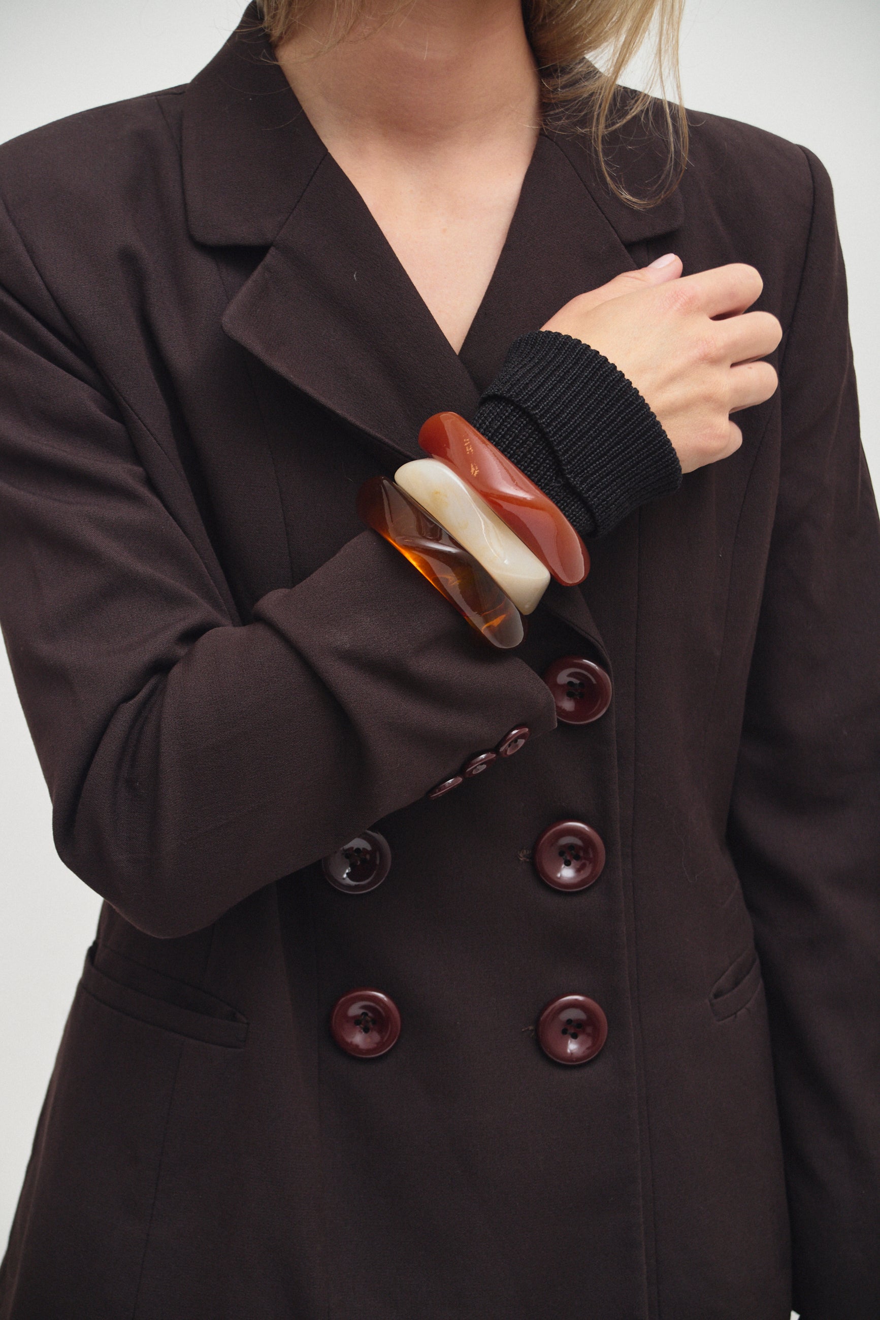 Double-breasted blazer in warm brown. Designed with notch lapels, button closure and details, and a relaxed fit.