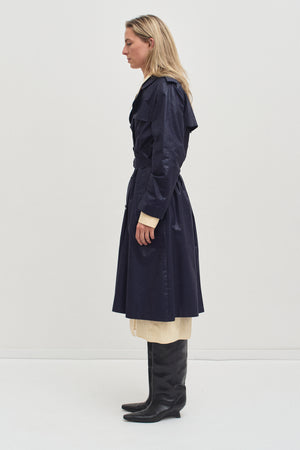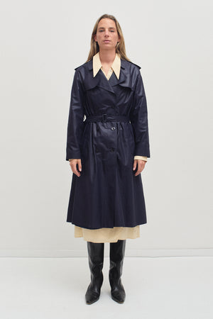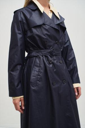 Glossy navy trench coat, double-breasted with a classic waist belt. Finished with two pockets for function and style.