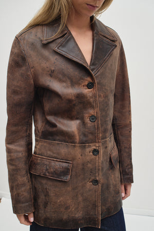 Brown leather blazer with a distressed finish, giving it a lived-in edge. Designed with a notched collar, front button closure, and functional pockets, it combines classic tailoring with character.