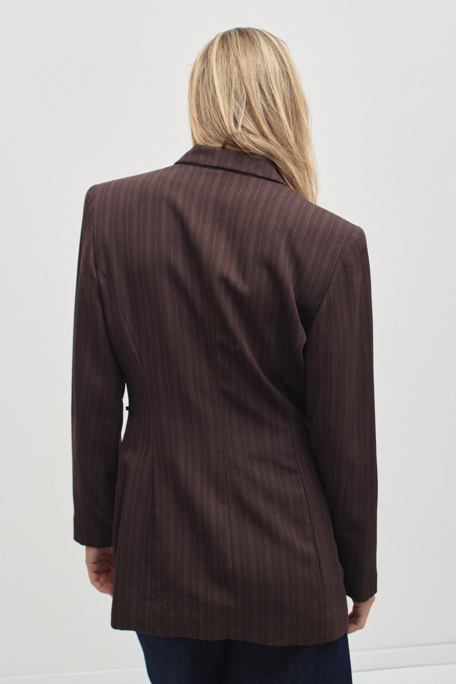 Tailored fit long brown pinstripe blazer with stunning mother of pearl buttons on the waist and main closure. Relaxed shoulders, fitted waist and sleek look. Found in Italy.