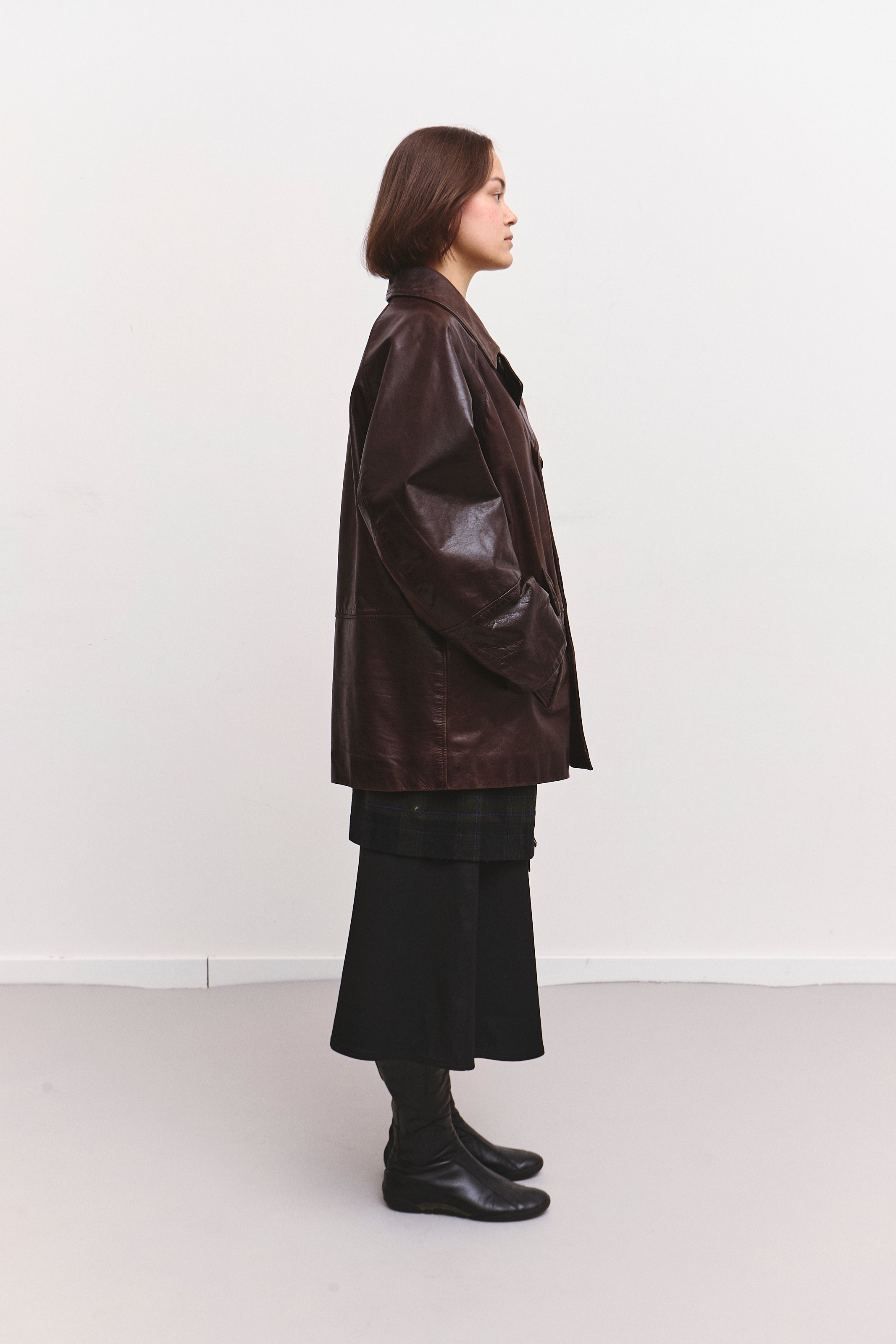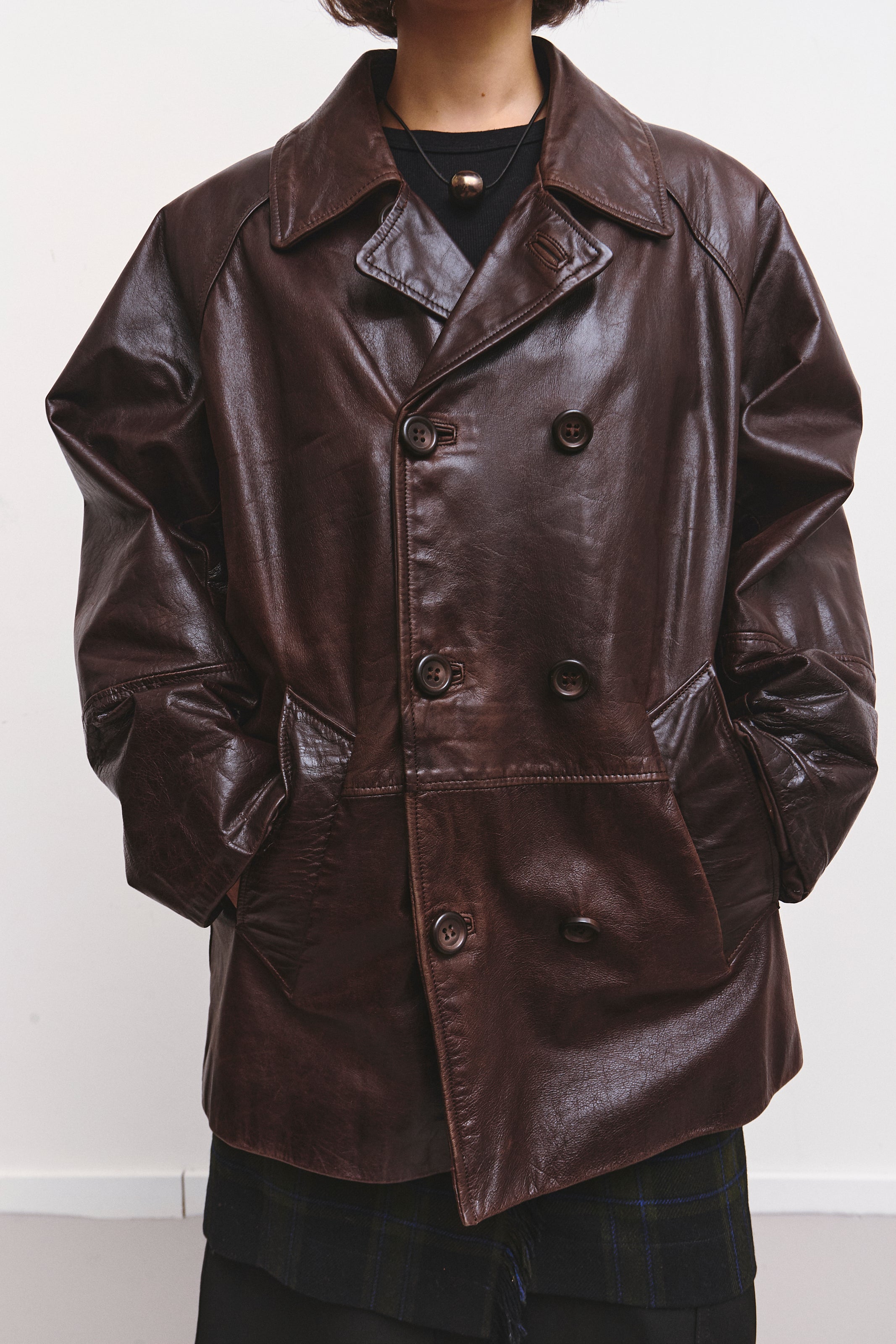 An oversized dark brown leather jacket with a thick, padded interior for exceptional warmth. Finished with a double button closure for structure and style.