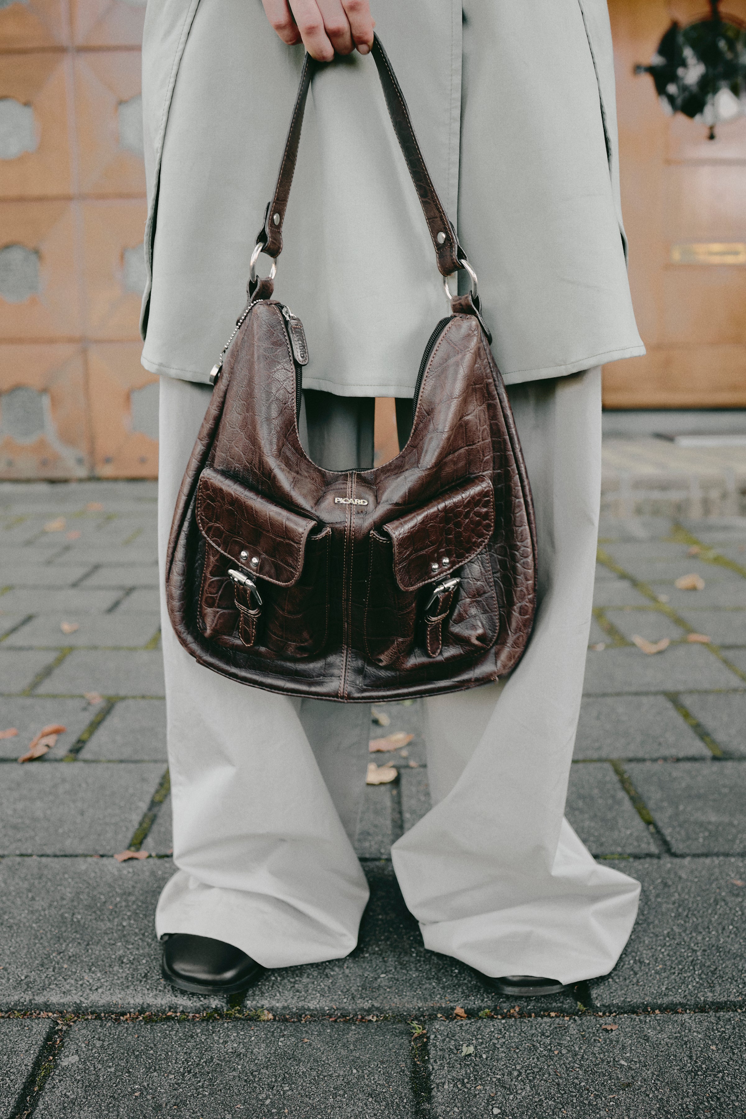 A structured yet slouchy bag with two buckle pockets in the front, and one more subtle pocket in the back. Crafted in brown leather with an attachable longer strap. Features silver-tone hardware and inside pockets.