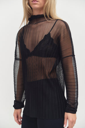 A lightweight sheer pleated top with a high round neck and balloon sleeves. Perfect for layering over a bralette or cami for an elevated look.