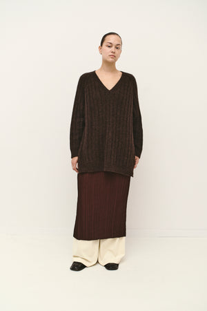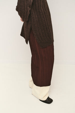 Accordion-pleated skirt with a elastic waistband. The finely structured pleats create fluid movement.