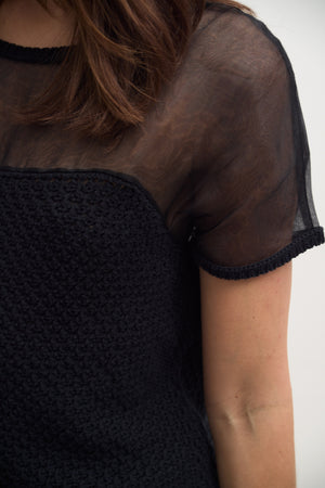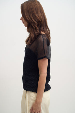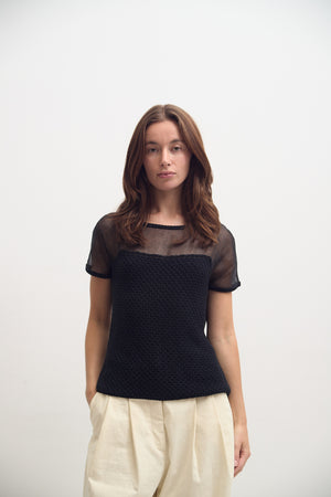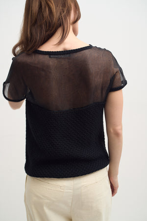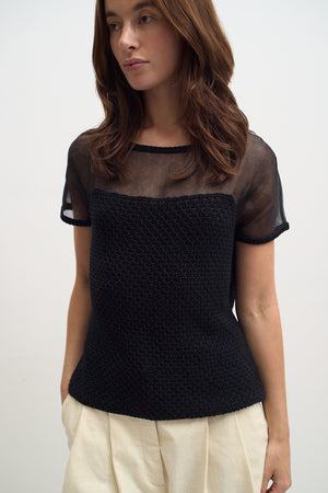 Semi-sheer short-sleeve blouse featuring a statement crochet-knit bodice. Lightweight organza panels at the shoulders and sleeves add a soft, refined texture. A delicate interplay of structure and transparency.
