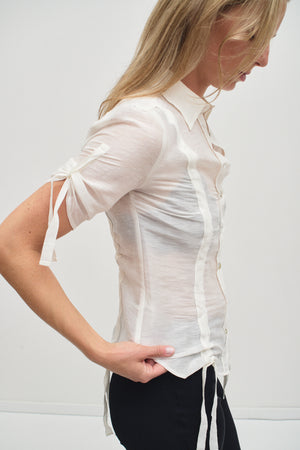 A sheer button-up blouse with short sleeves and adjustable drawstring details at the sides and hem. Designed in lightweight ivory fabric with tonal vertical paneling for a flattering look.