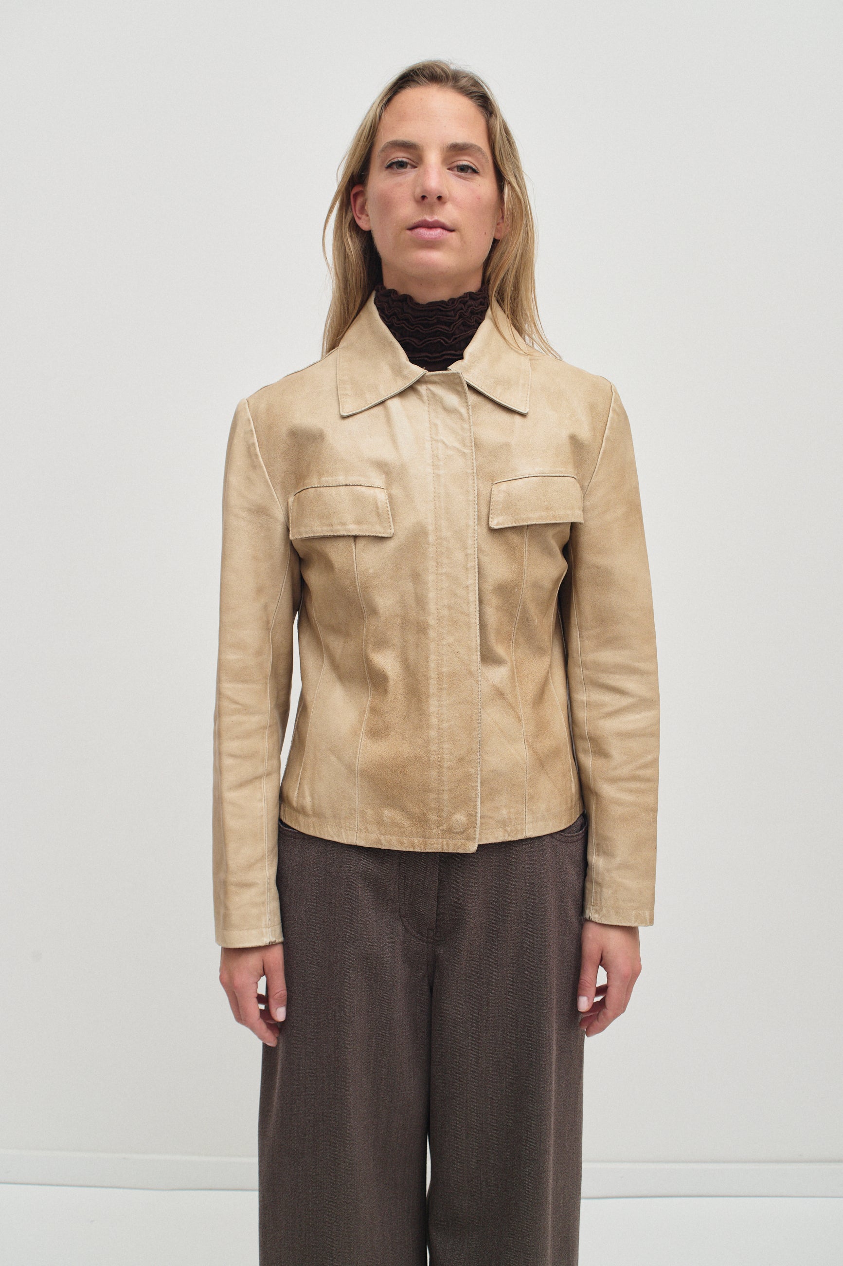 Beige leather jacket with a hidden front zipper and two front pockets. Crafted from supple leather featuring a simple collar and clean lines.