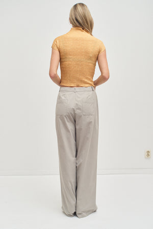Crinkled peach top featuring a sculptural V-neckline that gently folds at the collar. Designed to sit above the navel, this stretchy piece combines texture with a modern silhouette.
