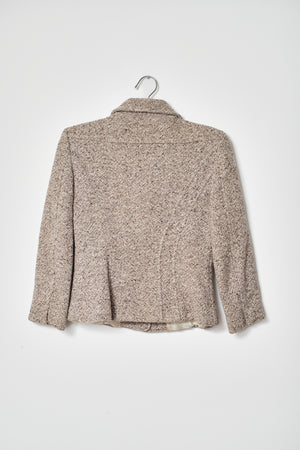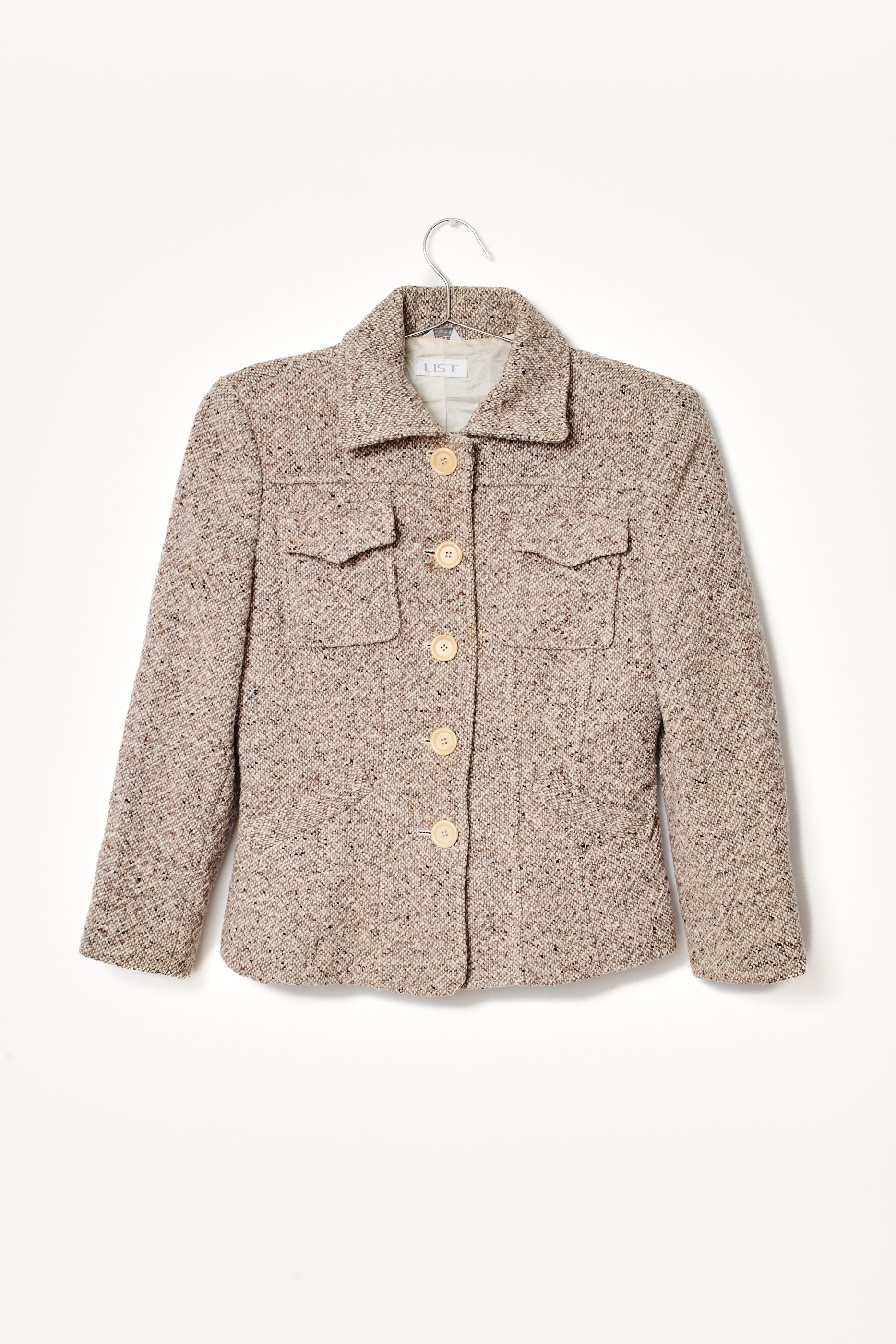 Classic tweed-inspired jacket in a warm beige melange tone. Features structured shoulders, two front flap pockets, tonal stitching and contrasting light buttons. A timeless, easy-to-style piece.