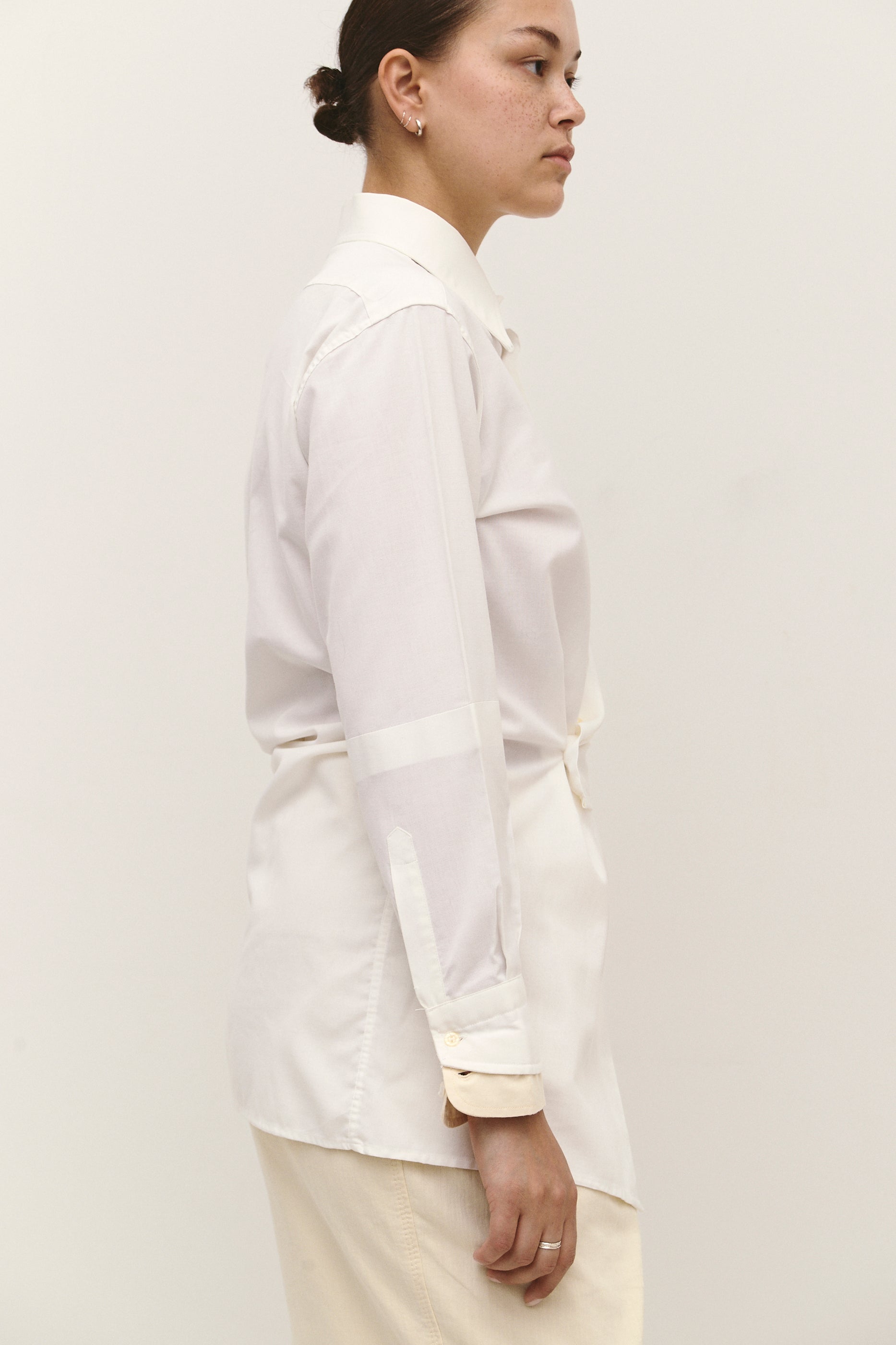 Upcycled side crop shirt ft. a new double cuff design. It can be worn asymmetrical -with a gather effect- or sharp oversized with a visible cut out side.