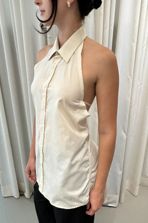 Features a clean front with a high neckline and a single neck button. The back is open and adjustable with two slim ties and an overlapping asymmetrical panel for a sculptural silhouette.