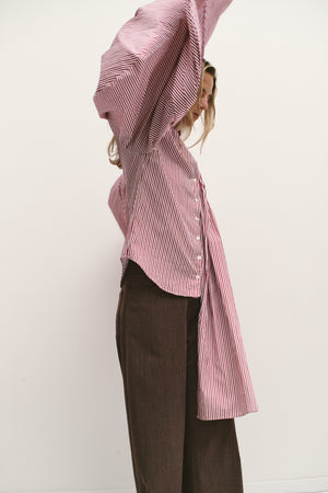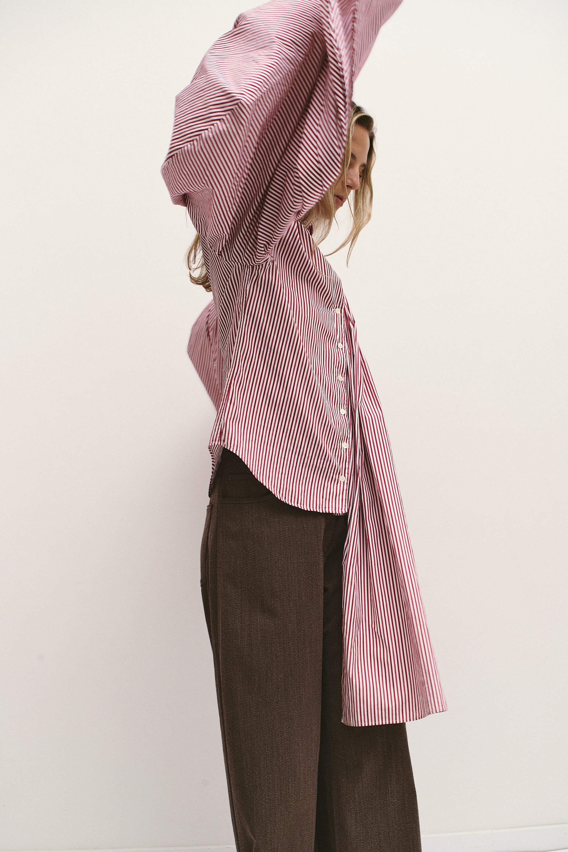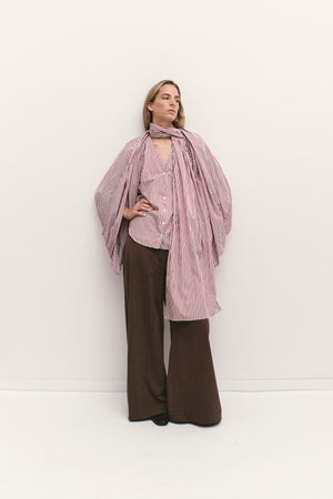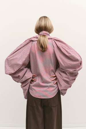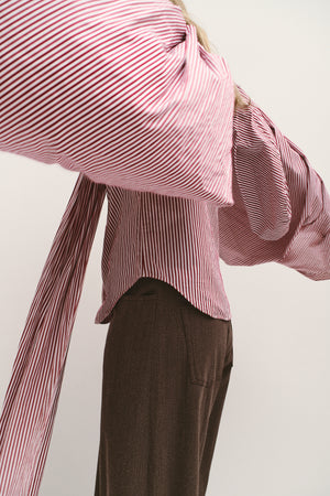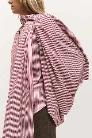 Oversized button-up which features bold red and white stripes, voluminous balloon sleeves, and a unique built-in scarf detail that drapes naturally for a sculptural silhouette. Crafted from lightweight cotton, it moves beautifully and layers easily.