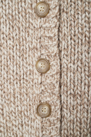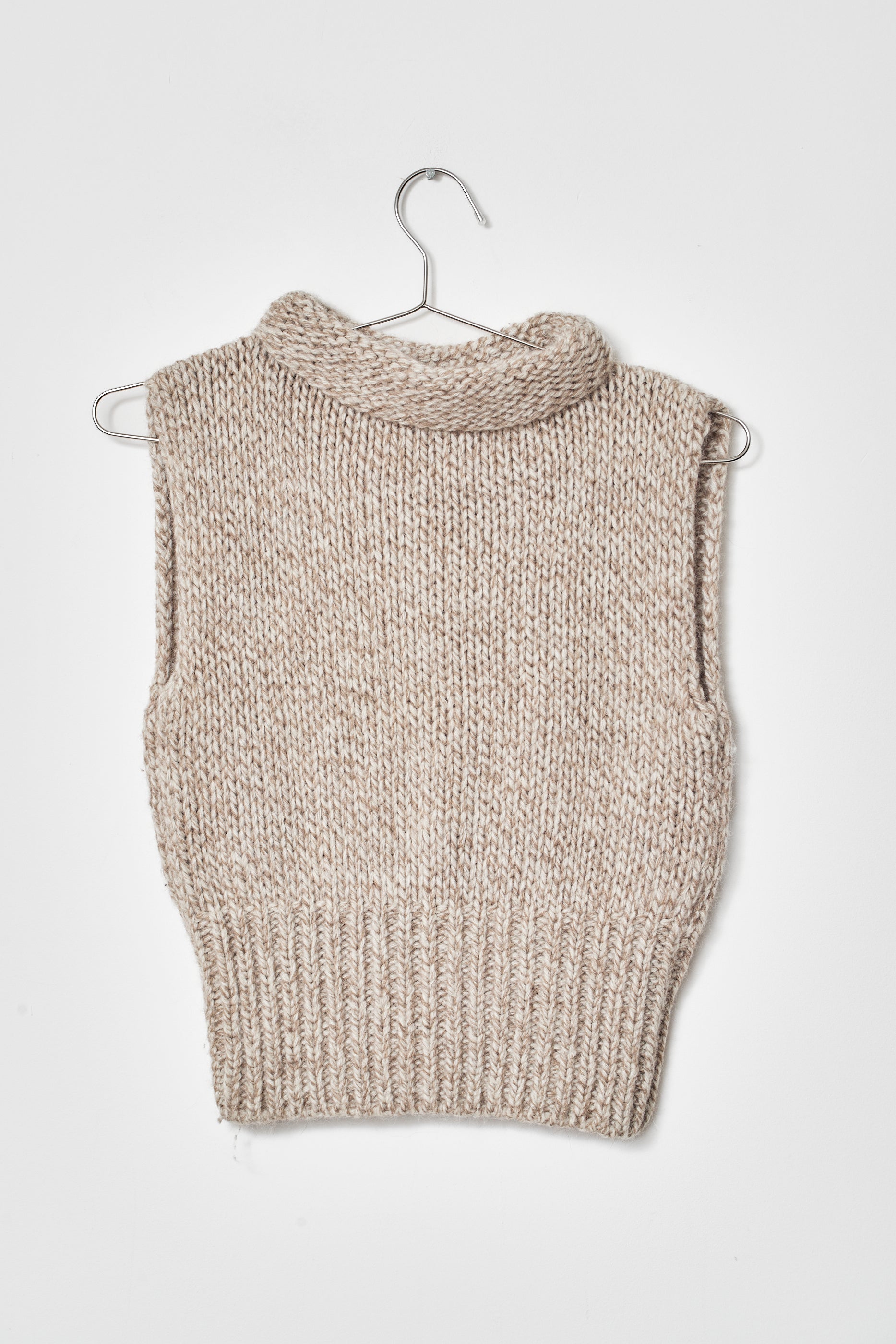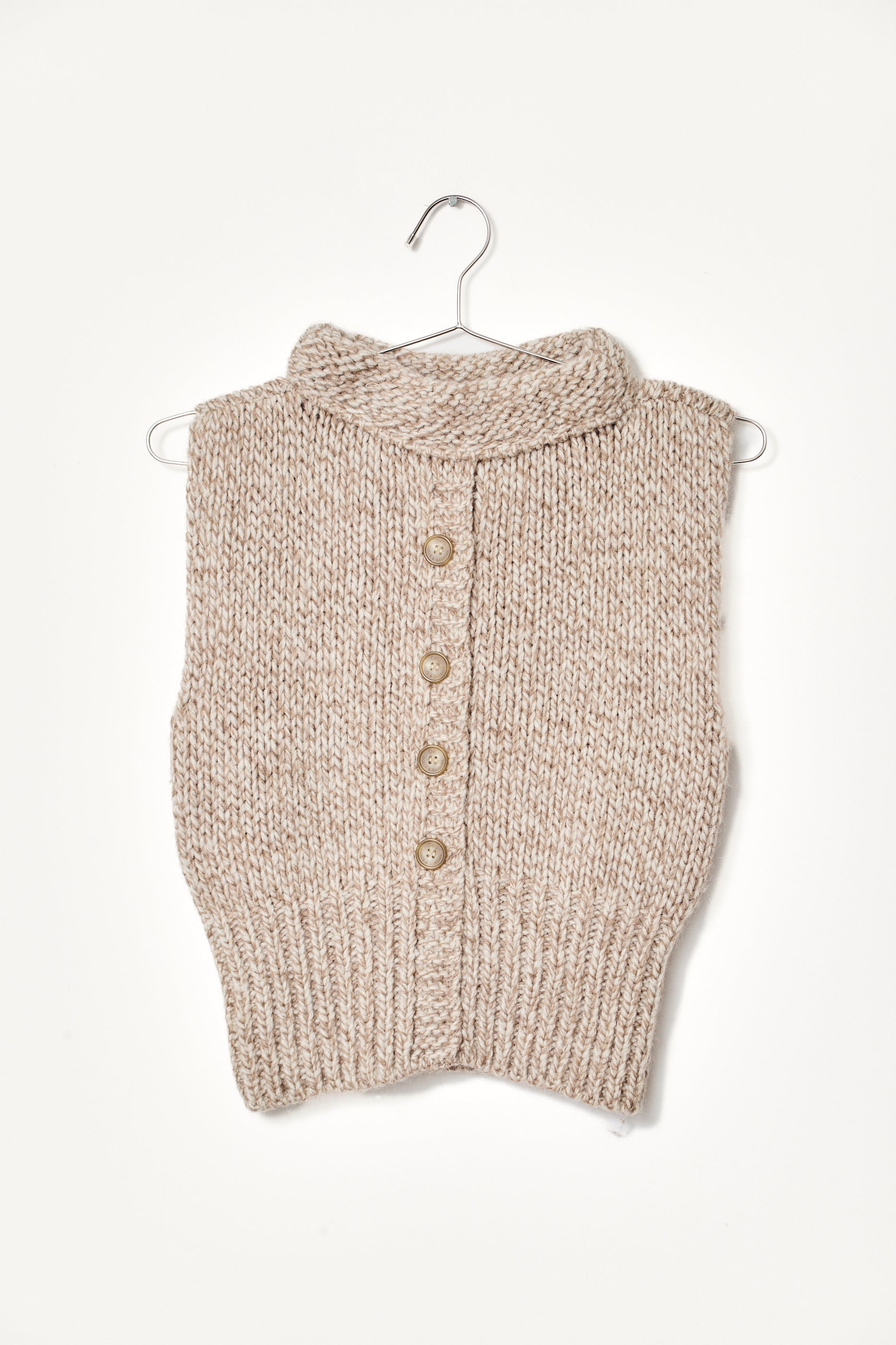 Chunky knitted vest by D&G in a soft beige marl. Features a high rolled neckline and button-back closure. Perfect layered over shirts, dresses or long sleeves.