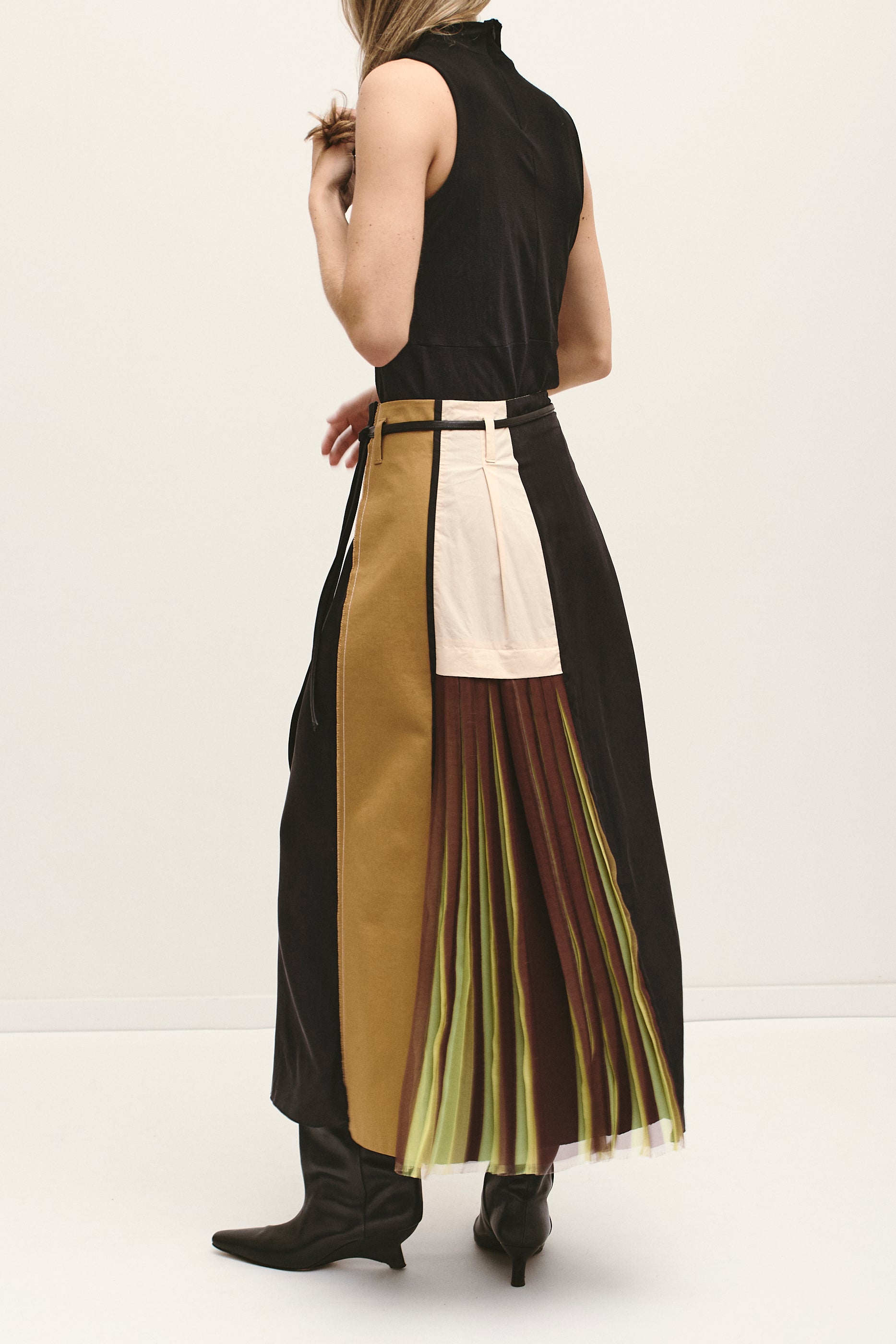 Avant-garde patchwork maxi skirt by Dorothee Schumacher. Crafted from a mix of structured panels and flowing pleats. Features contrast sections in camel, black, and cream with a multicolored pleated underlayer in shades of brown, lime, and soft yellow.
