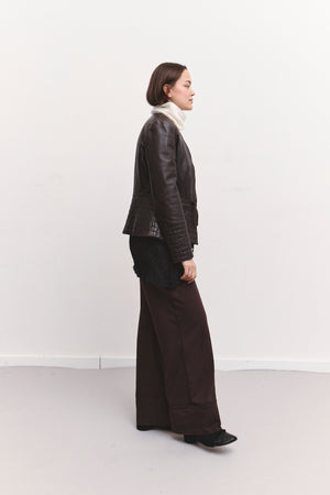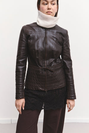 Classic tailored leather jacket in a rich chocolate-brown tone, designed with a structured silhouette that contours the waist. Features a clean front zip closure, subtle panel detailing, and a stitched waist belt that adds gentle shaping. Long, quilt-stitched sleeves bring a refined, elevated feel.