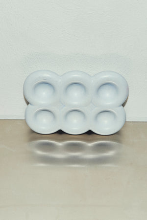 A playful yet sculptural egg tray for six, featuring a bubbly texture and a soft sky-blue finish. Functional with personality, it brings a touch of whimsy and color to your kitchen or table — practical, cheerful, and entirely unique.