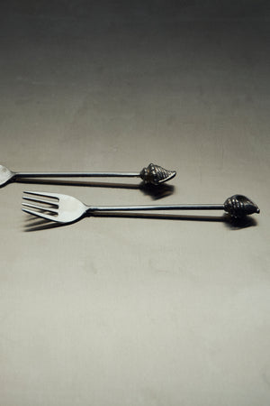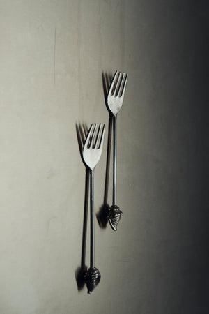 A set of sterling steel mini forks with delicate shell details at the ends. Minimal yet whimsical, each piece combines sculptural elegance with subtle seaside charm — perfect for entertaining or as a playful tabletop accent.
