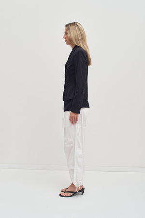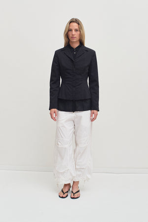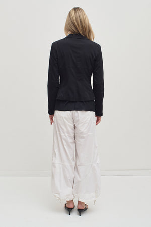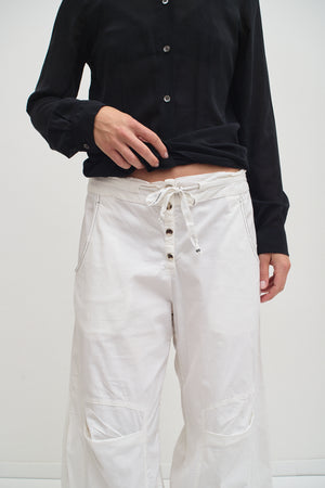 White balloon pants with pleated knees and a relaxed silhouette. Four metal buttons, functional pockets, and drawstring hems allowing versatility to the loose, sculpted fit.