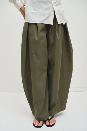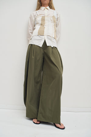 Oversized wide-leg pants in green, designed with exaggerated volume and sharp front pleats.