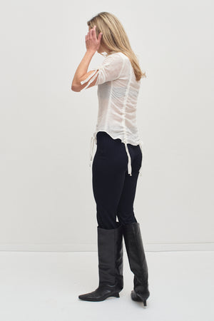 Straight-leg pant in deep navy. High waisted silhouette with subtle structure makes it an effortless piece for both casual and refined looks.