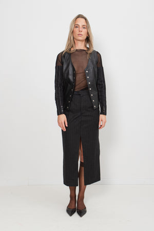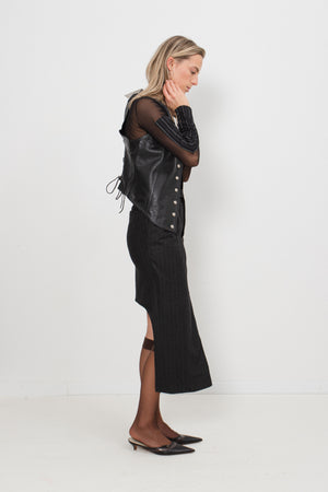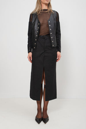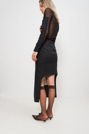 An upcycled & elegant take on the classic suit trousers. Front split with a cropped back design. All upcycled skirts are made from curated trousers.
