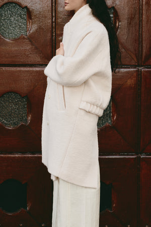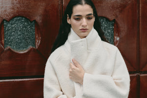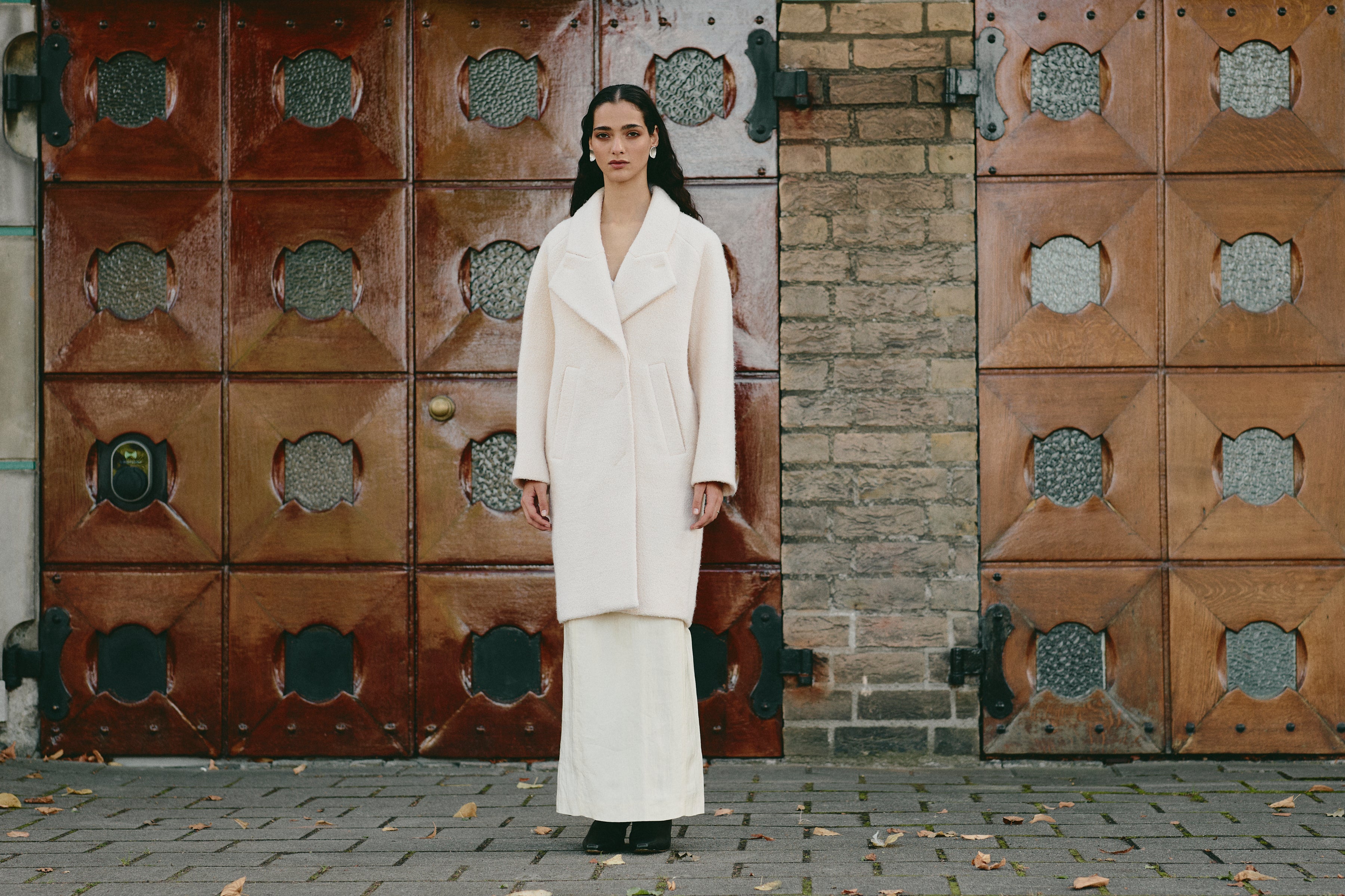 A wool coat with a bomber look on the back, tailored to perfection, knee-length and finished with two front pockets.