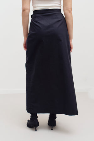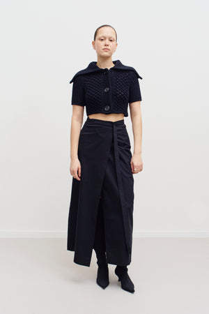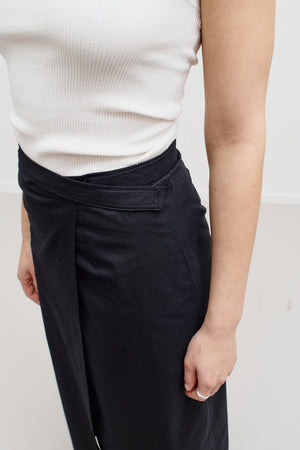 A timeless black wrap skirt by D&G with a sharp, flattering silhouette. Designed with a clean wrap front and subtle V-shaped waistband detail that accentuates the waist beautifully. Minimal, elegant and endlessly versatile. Extra long belt strap closes with velcro
