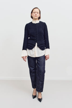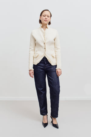 A timeless pair of JIL SANDER+ high waist jeans in deep raw indigo denim. Designed with a classic five-pocket construction, contrast stitching and a clean straight leg silhouette.