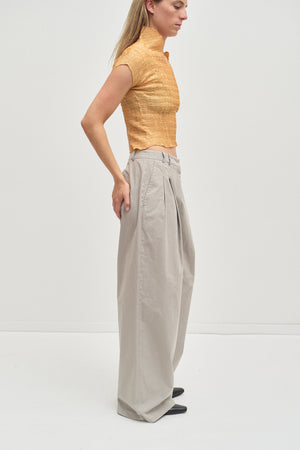 Jil Sander stone wide-leg pant with front pleats and four-pocket styling.