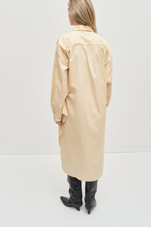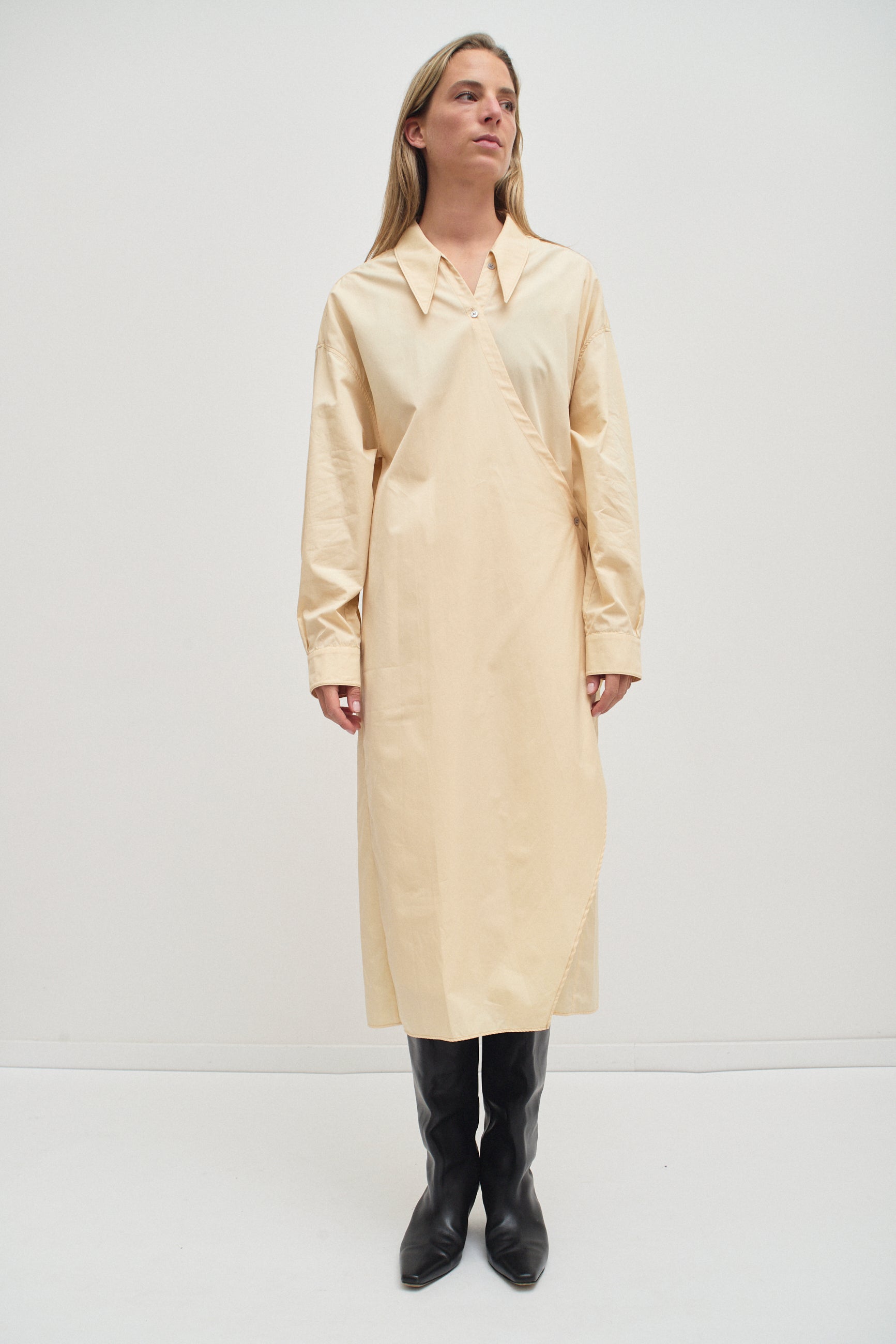 New Lemaire wrap dress with tag still attached, featuring a spread collar and dropped shoulders. Wrap construction with button closures and interior self-tie straps. Cream color, relaxed fit.