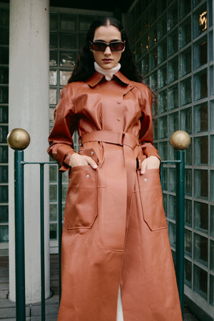 Port Tanger brown rounded edge sunglasses with rose colored lenses.