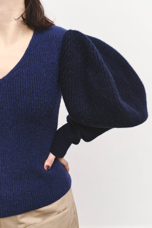 A Loewe knit sweater in varying shades of navy, featuring a tailored waist, voluminous balloon sleeves, and a flattering V-neck. Artistic, sculptural, and effortlessly elevated.