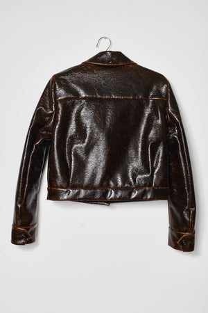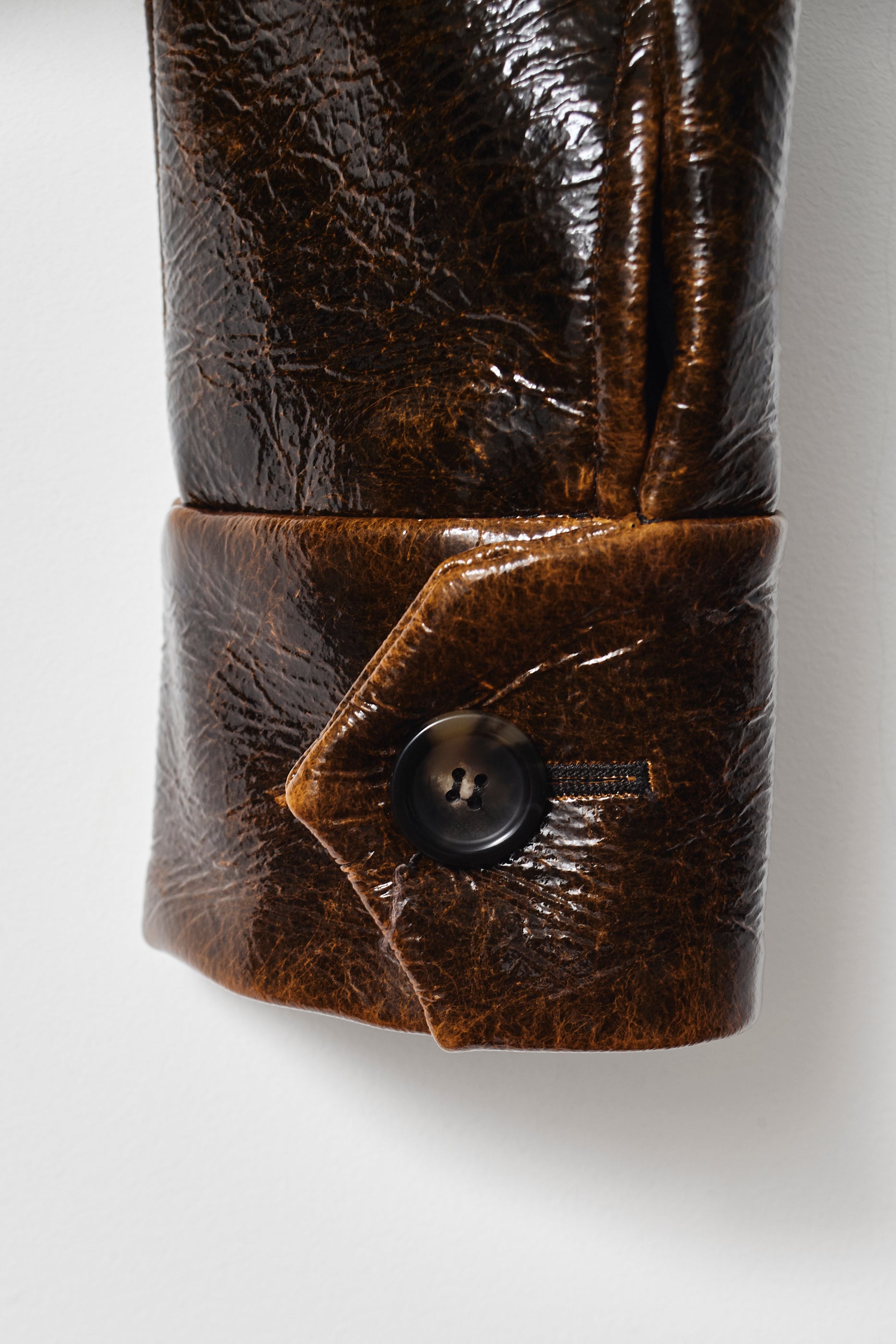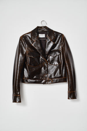 A lacquered Sportmax jacket with a glossy finish and modern minimalist shape. Designed with two large front flap pockets and a button closure.