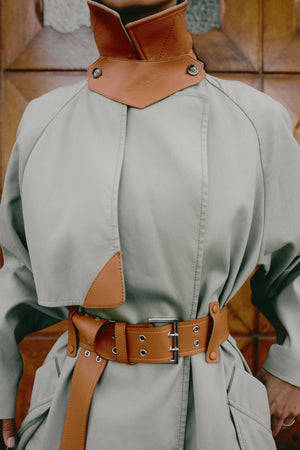 This Sportmax trench coat blends minimalism with structure, featuring an oversized, tailored silhouette in muted tones. Contrasted statement collar, back detail and two big pockets. Features a leather belt with silver details for a customized fit and closure.