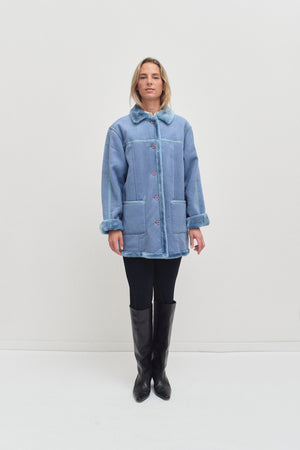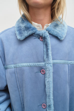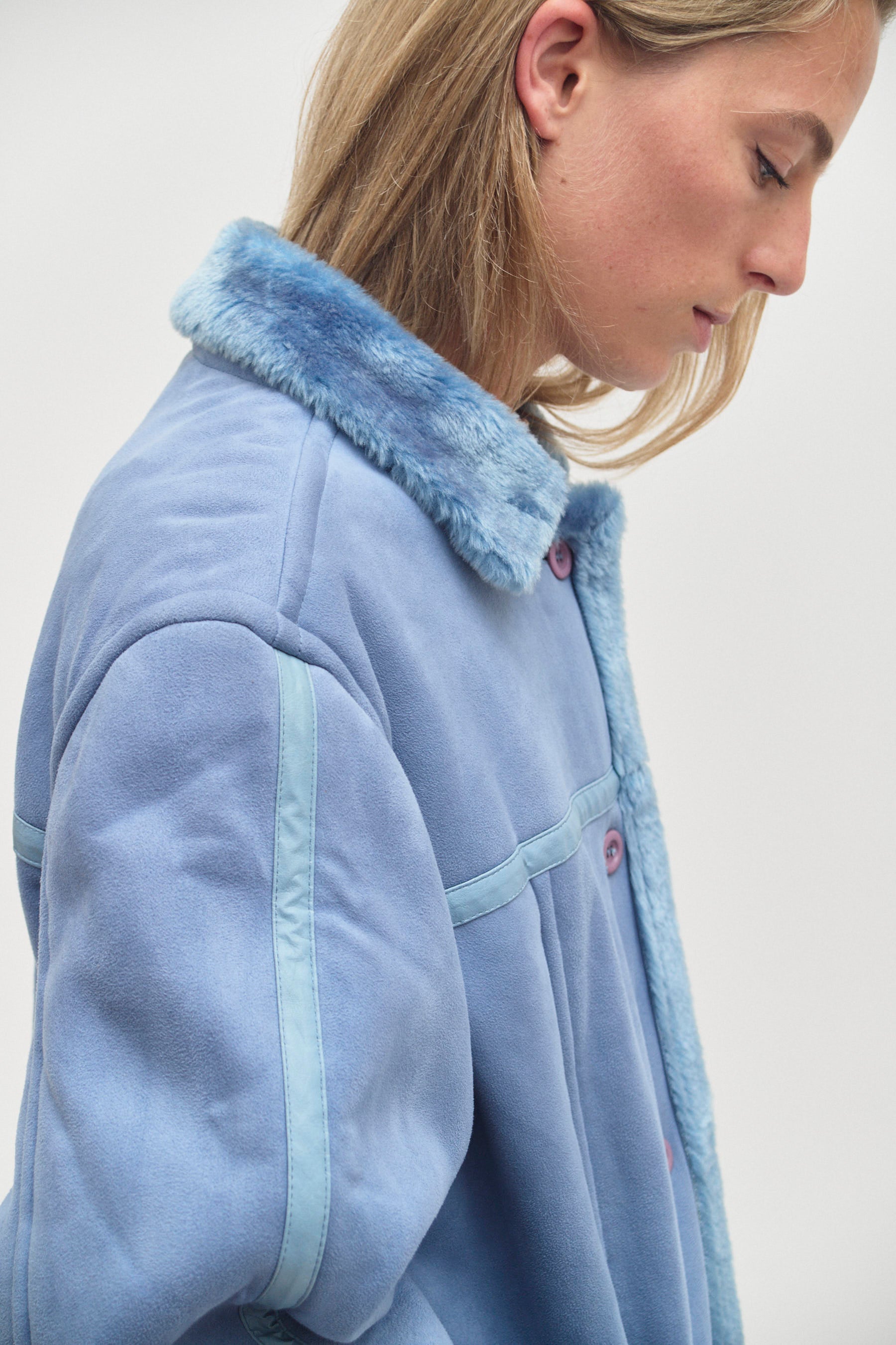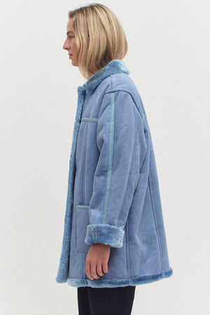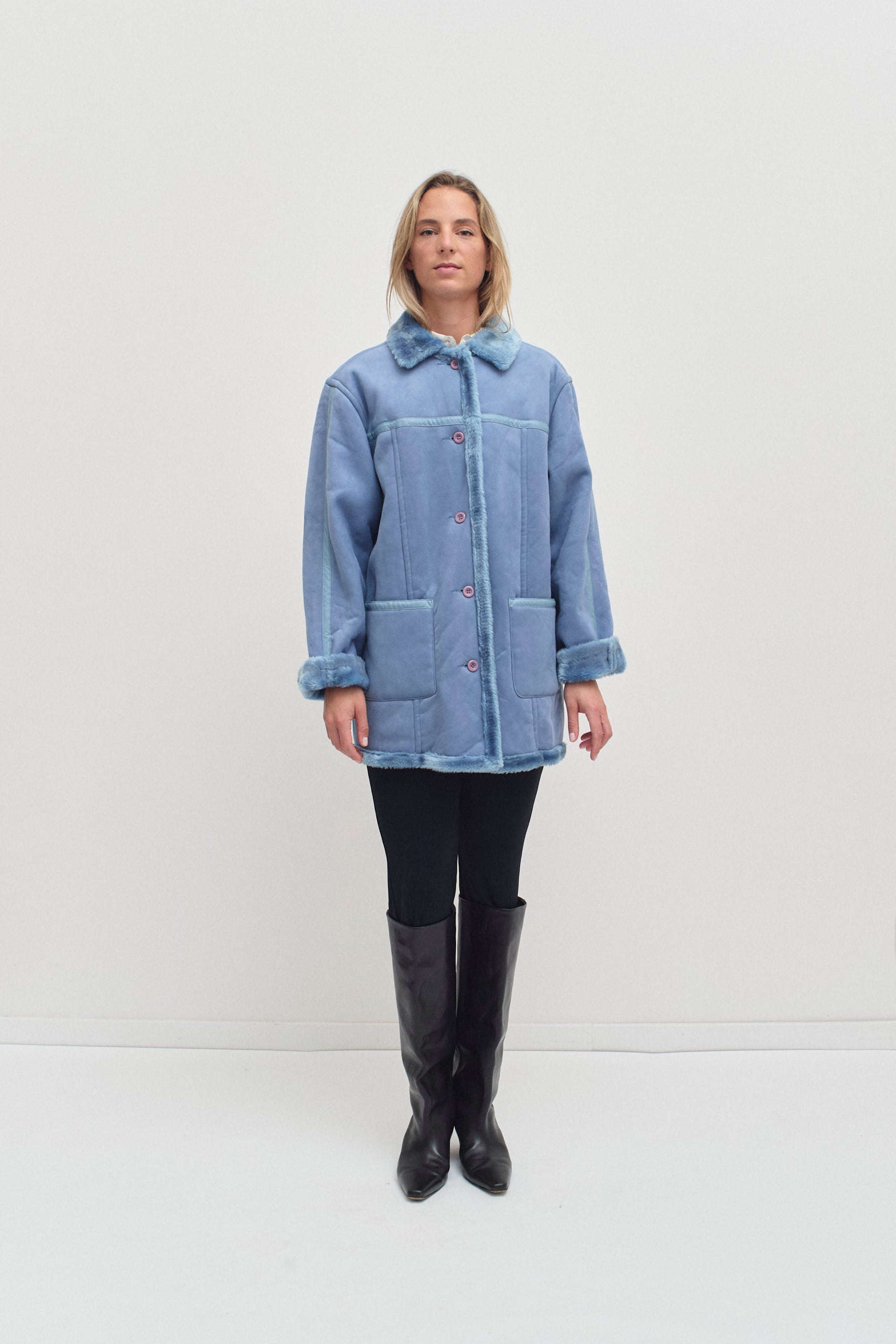 A soft blue lammy coat lined with faux fur for warmth. Its loose, straight silhouette and button closure make it an essential for winter days.