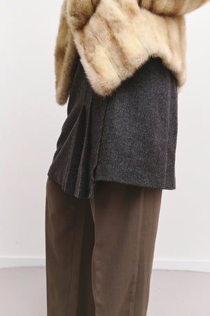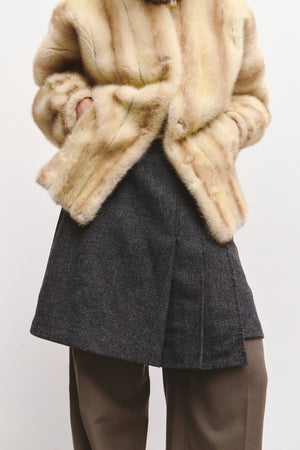 A grey wool mini wrap skirt featuring a tying detail, subtle pleats, and a clean A-line silhouette. Modern, minimal, and effortlessly chic.