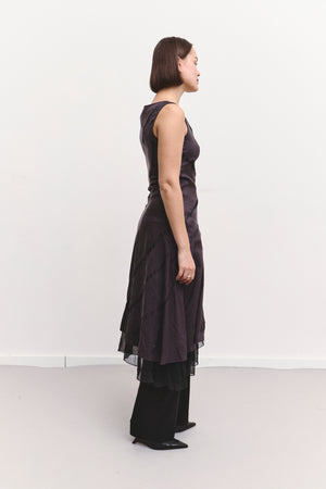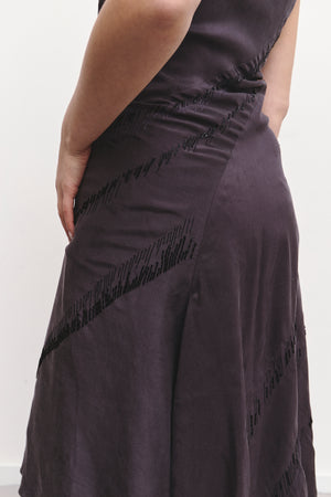 A plum-colored maxi dress with a flattering V-neck, intricate beaded embroidery, and delicate, flowy stitching. Elegant, detailed, and effortlessly feminine.