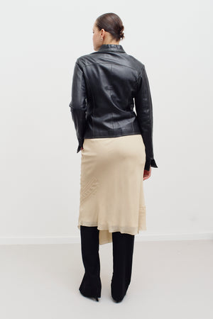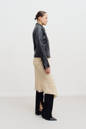 A soft, fluid skirt in a light sand tone with a semi-sheer finish. Designed with a clean waistband and subtle frayed panel detailing near the hem, adding quiet texture and movement. Cream-nude color.