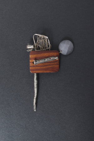 An abstract miniature sculpture combining hand-twisted metal wire, a polished stone detail, and a warm wooden base. This brooch feels like wearable art — expressive, tactile and unlike anything mass-produced. A unique piece to pin on a coat, knit or scarf for an artistic touch.