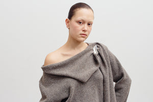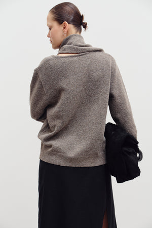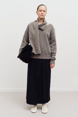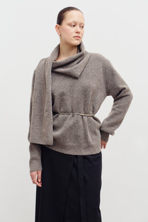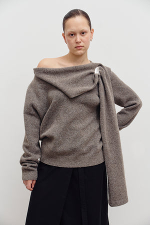 Ultra soft oversized taupe sweater with a beautiful scarf detail for an elevated look.
