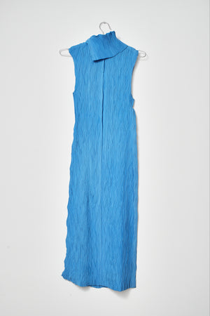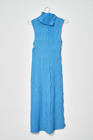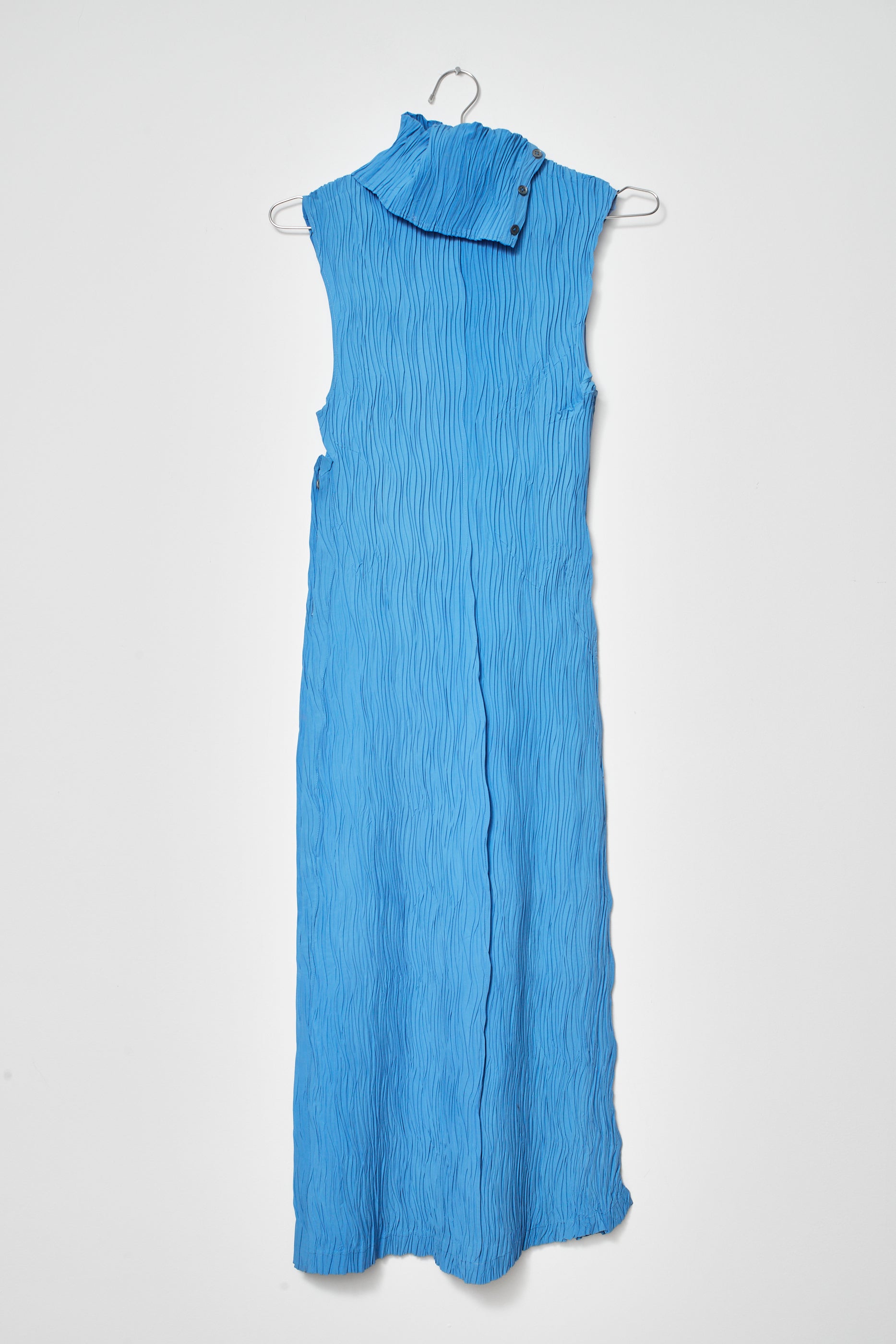Acne Studios bright blue pleated dress with button details along one side, opening from just below the shoulder down to the hem. Additional buttons at the collar add a refined touch. Can be worn as a dress or styled open as a long top over pants.