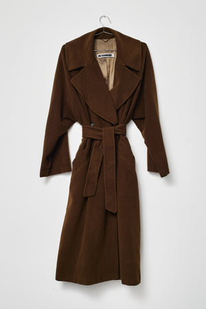 Jil Sander olive green oversized coat embodies sophisticated minimalism. Features a hidden adjustable waistband for a customized fit. Made in Italy, this double-breasted piece is crafted from melange wool.