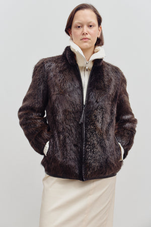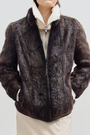 A short brown fur mock neck jacket with a zip-up closure and leather trimmings around the sleeves and zipper. Cozy, chic, and effortlessly stylish.