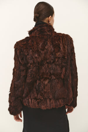 Brown fur coat featuring two drawstrings, one at the collar and one at the waist. Warm yet refined.